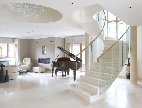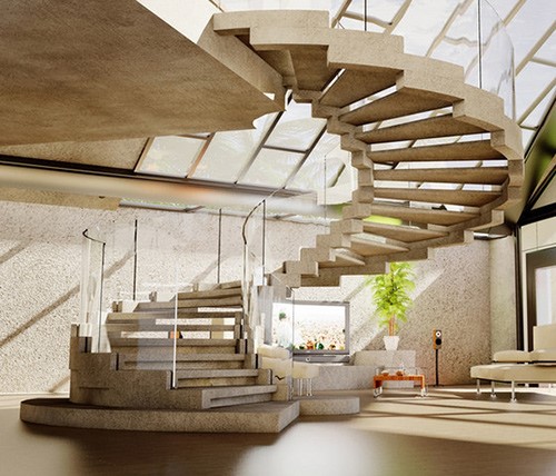 + Cầu thang kính uốn cong (phù hợp với không gian cầu kì, sang trọng để tạo nét độc đáo cho kiến trúc).